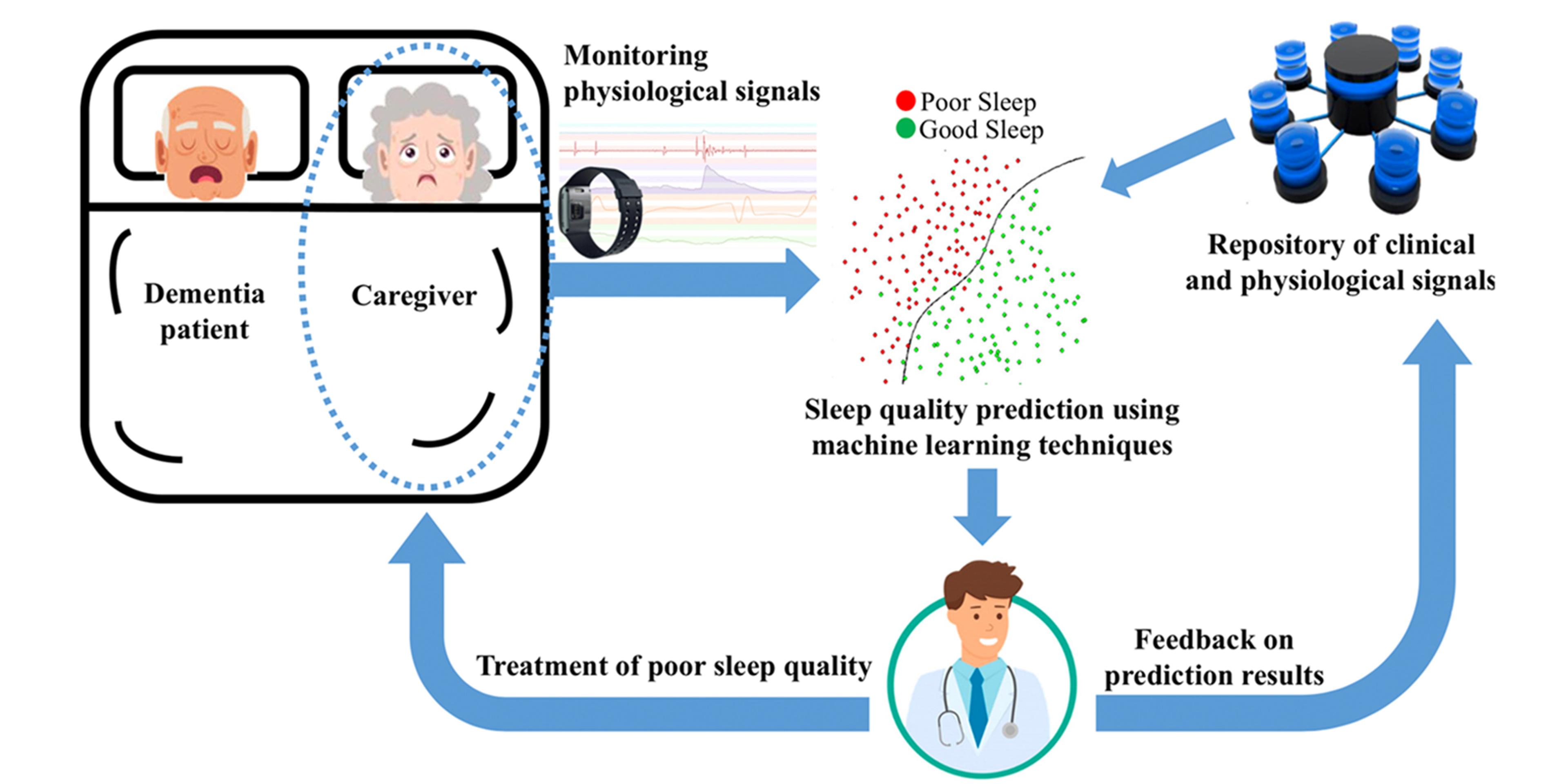We monitored the physiological signals of CPWD during their sleep using E4 wristbands. The collection of these physiological signals and the clinical history of CPWD formed our repository that was used to train machine learning techniques. Following this, we identified the sleep quality of new caregivers using trained machine learning techniques to be presented to their physicians. These results can aid physicians to provide the required intervention or social support resources to help alleviate the burden for caregivers. The feedback of physicians regarding the prediction outcomes is added to the repository of clinical and physiological signals to improve further predictions.