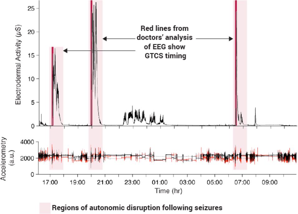The duration of PGES correlates with the size of the EDA measured on the wrist. Thus, EDA can be used both as an indirect biomarker for SUDEP and a measure of autonomic disruption.