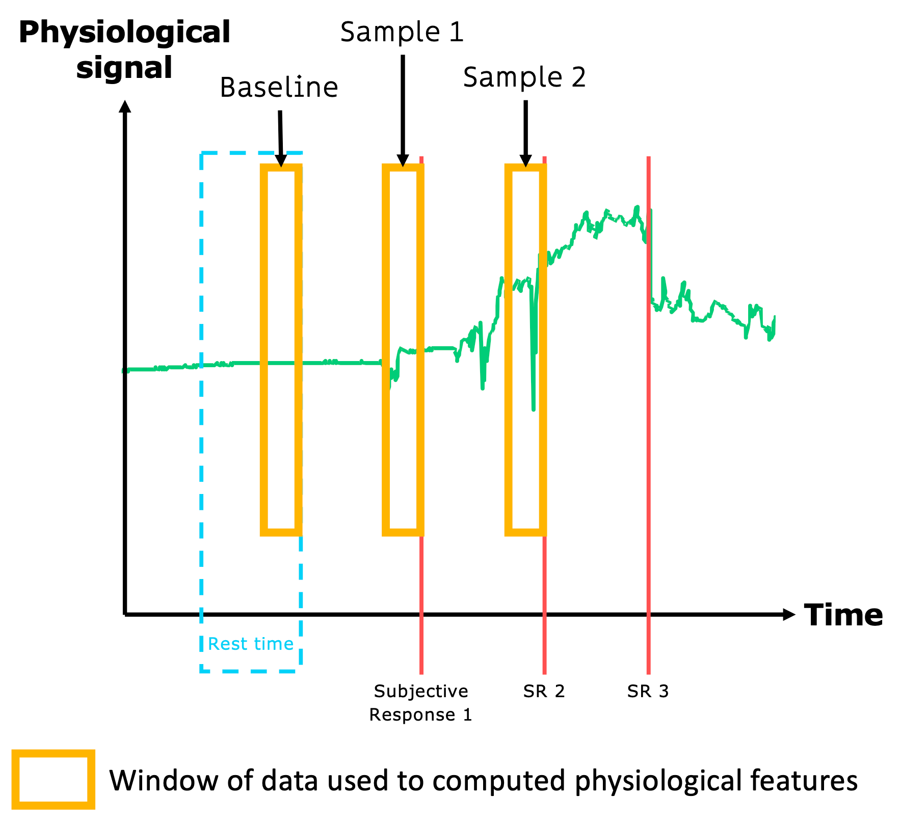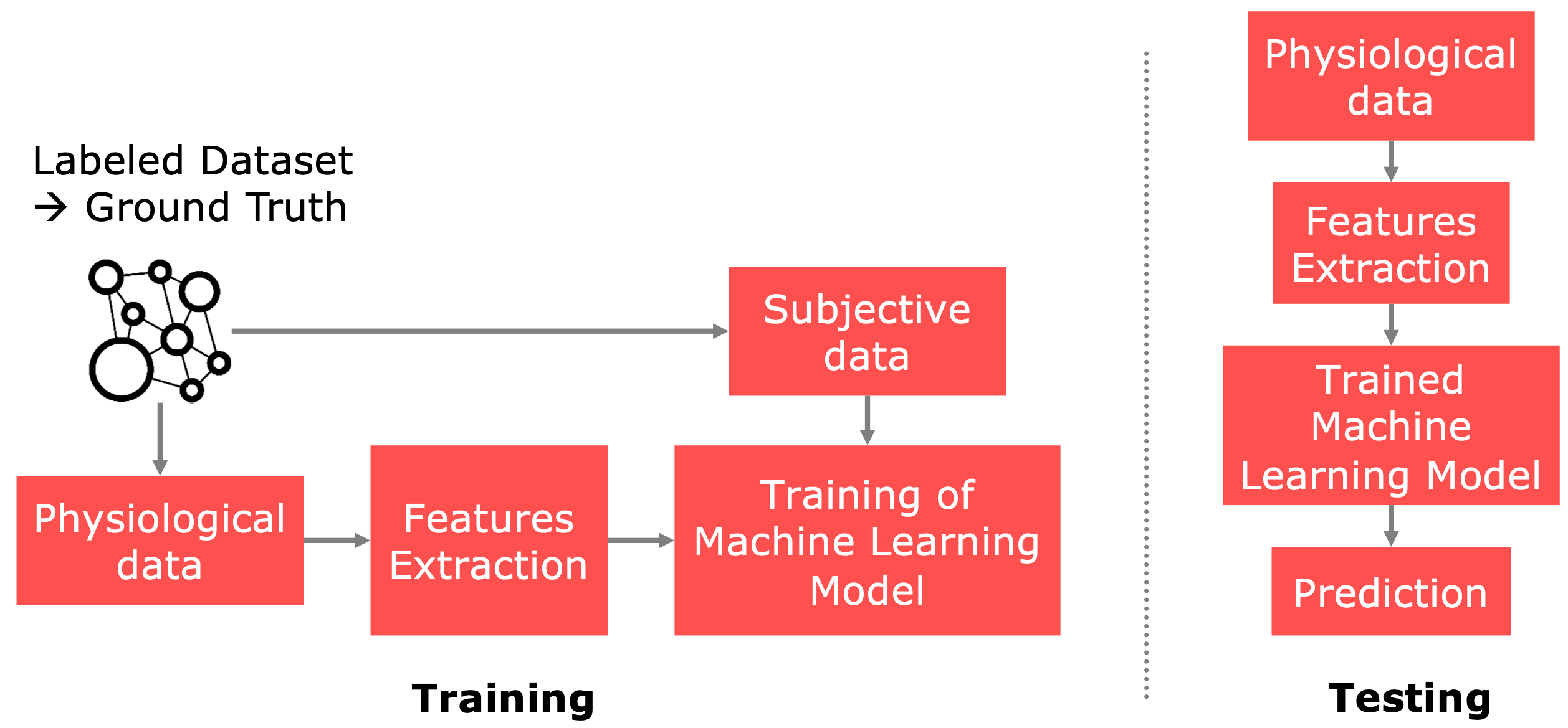 The exploitation of physiological signals, however, is very challenging. The recent emergence of Machine Learning methods opens new opportunities to go beyond previous limits. Using supervised techniques, the training of Machine Learning models intends to automatically infer the function between the input data (i.e. extracted physiological features) and output data (i.e. VR sickness level): see Figure 1. In other words, models are trained to detect the physiological patterns associated with VR sickness levels. After training, these models could provide a relevant method to automatically recognize VR sickness, in real-time, using the physiological data without requesting a subjective response.