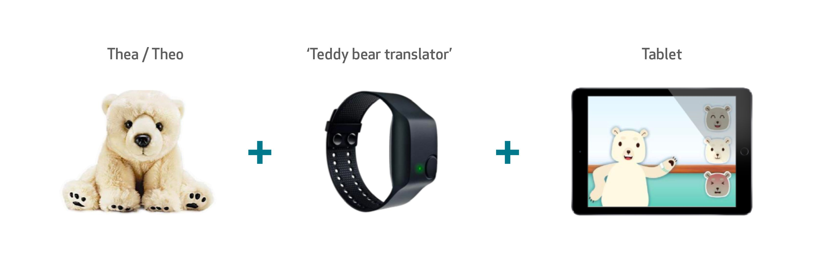 The child receives a teddy bear, called Theo (or Thea), and an E4 wristband, presented as a teddy bear translator (a way for the child to communicate with the toy).