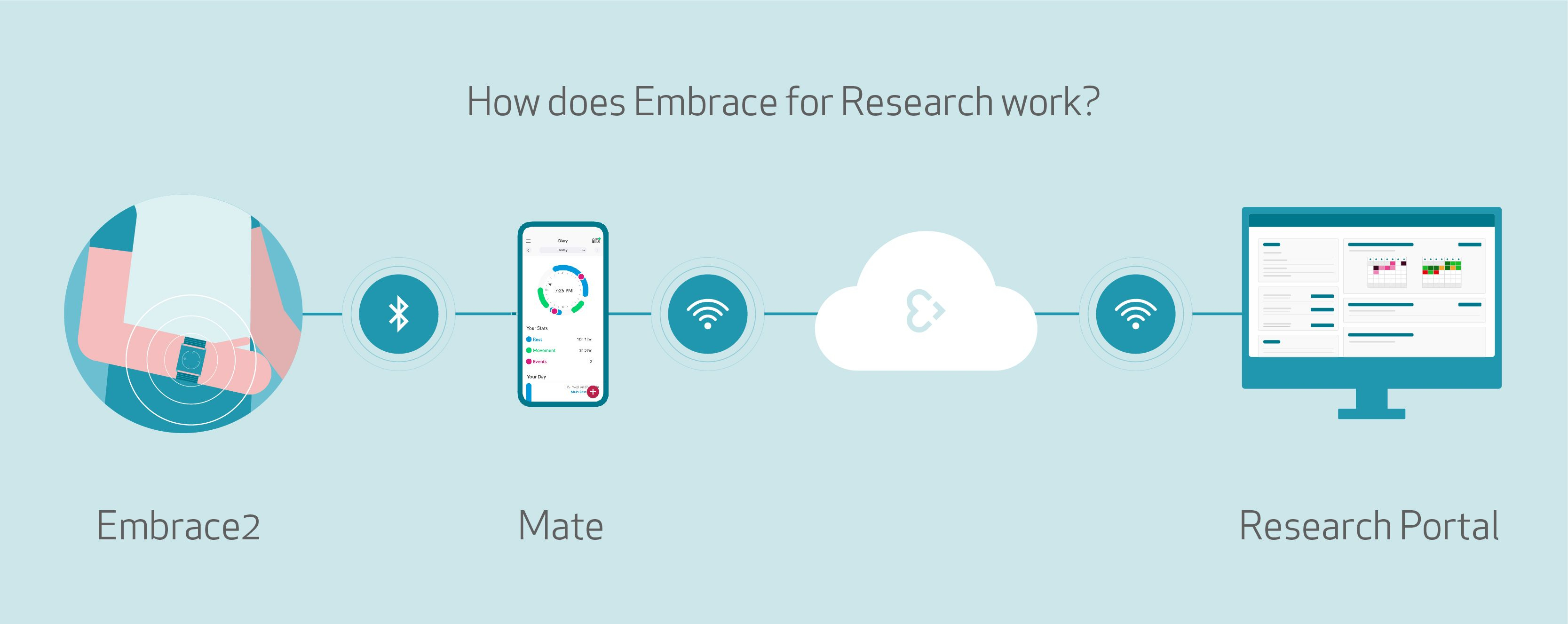 - The Embrace2 smart watch for study patients that continuously collects and sends raw physiological and computed data through Bluetooth to a paired app: Mate.