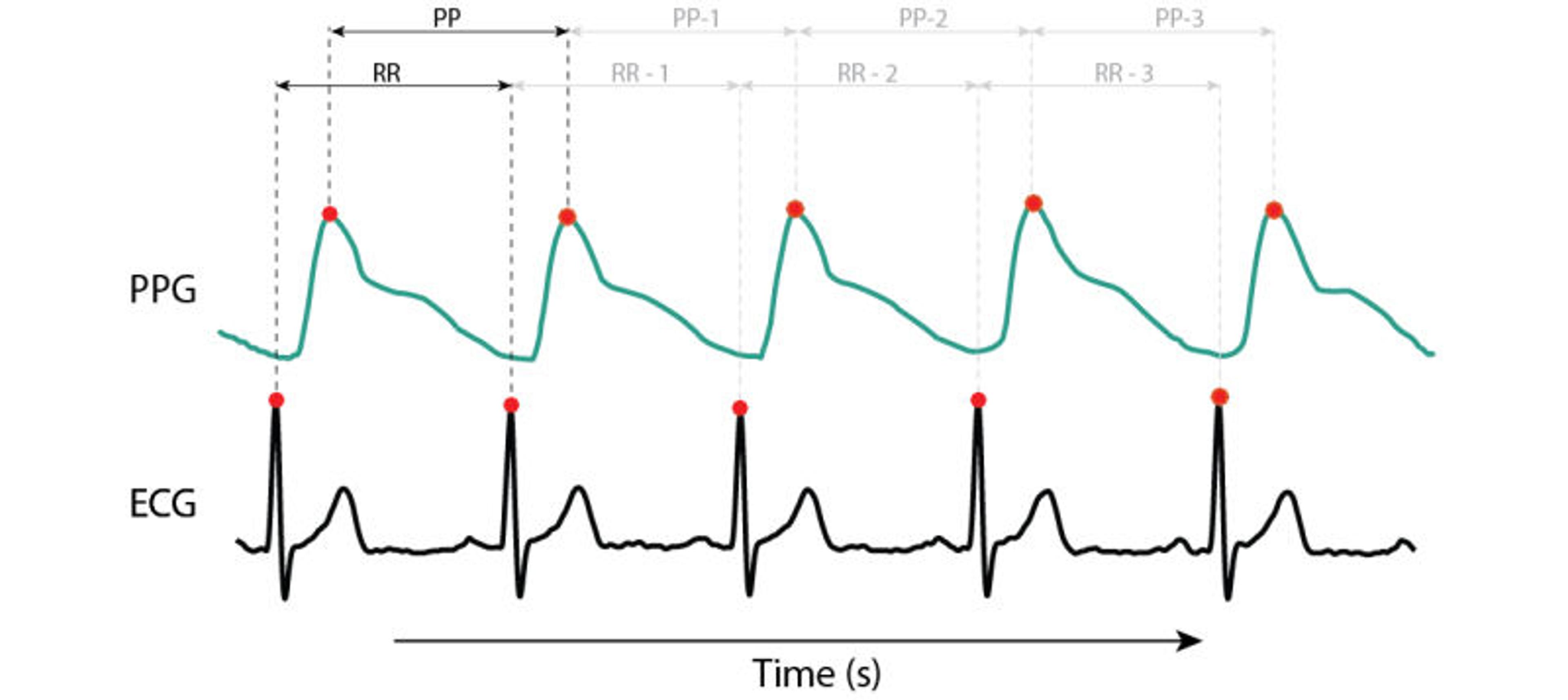 Currently, the primary method of deriving the HRV signal is to acquire the electrocardiogram (ECG) signal, apply appropriate QRS detection algorithms to locate the R wave and its peak, compute the RR intervals (refer to image), from which HRV indexes are derived. This process could sometimes result in errors in the HRV signal due to drift, electromagnetic and biologic interference, and the complex morphology of the ECG signal. A recent study has demonstrated the potential of the photoplethysmographic (PPG) signal to eliminate some of the problems with the ECG signal to derive the HRV signal [11]. In another study, electrocardiogram and PPG methods have proven to yield discrepancies of less than 6% for most HRV measures [12].