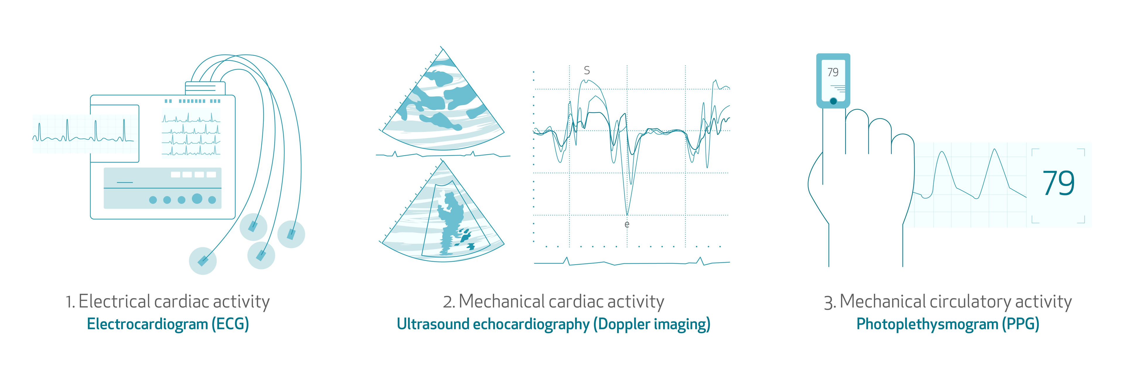 - Mechanical cardiac activity: ultrasound echocardiography (e.g. Doppler imaging).