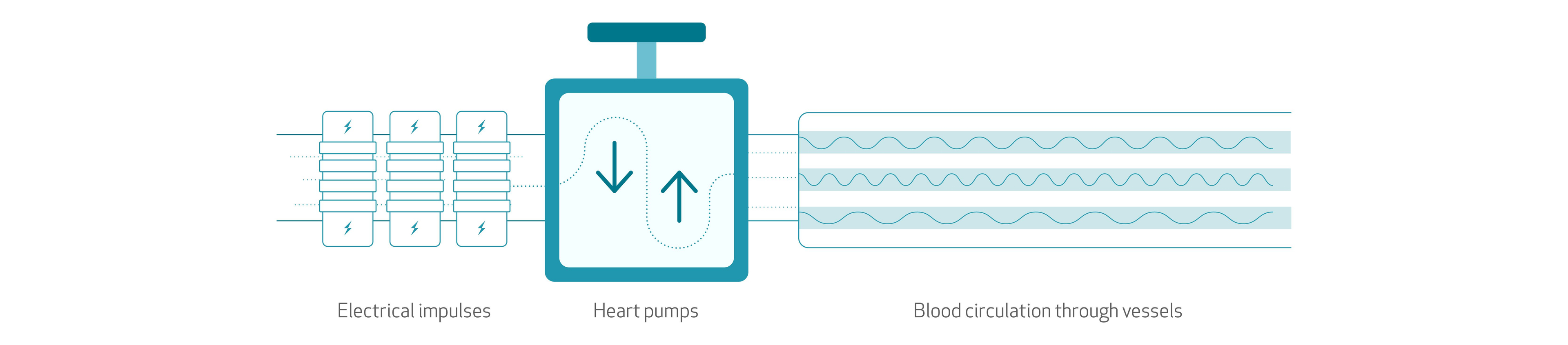 The heart is essentially an electromechanical pump: a precise pattern of electrical instructions produces a corresponding pattern of mechanical contractions that circulate blood around the body through the blood vessels.