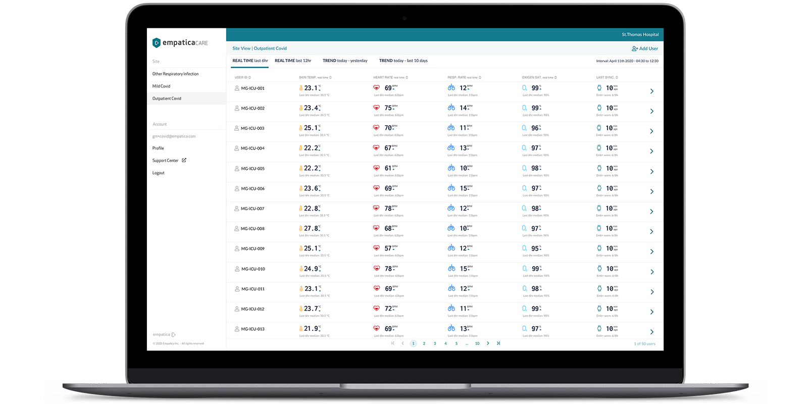 Centralized dashboards, such as the one provided by Empatica Care, can help employers or other community leaders to remotely identify early warning signs even without symptoms, enabling clinical-quality insights and fast intervention. This can lead people to swiftly catch and isolate asymptomatic transmitters, maintaining a healthier workforce, and ultimately containing the spread, particularly in the most vulnerable communities or among front-line workers in the Covid-19 fight.