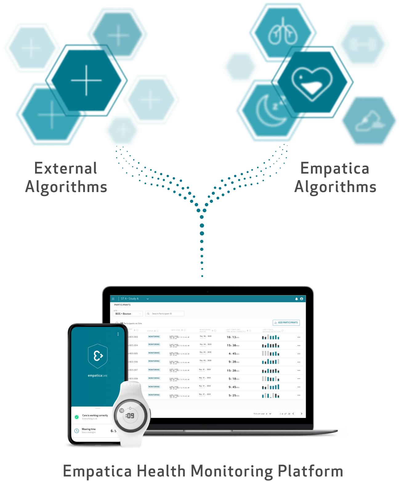 The Empatica Health Monitoring Platform seamlessly hosts and runs external algorithms powered by EmbracePlus. Over 300 digital endpoints* are ready to implement in clinical trials, combining insights from Empatica and the world's leading digital biomarker developers.