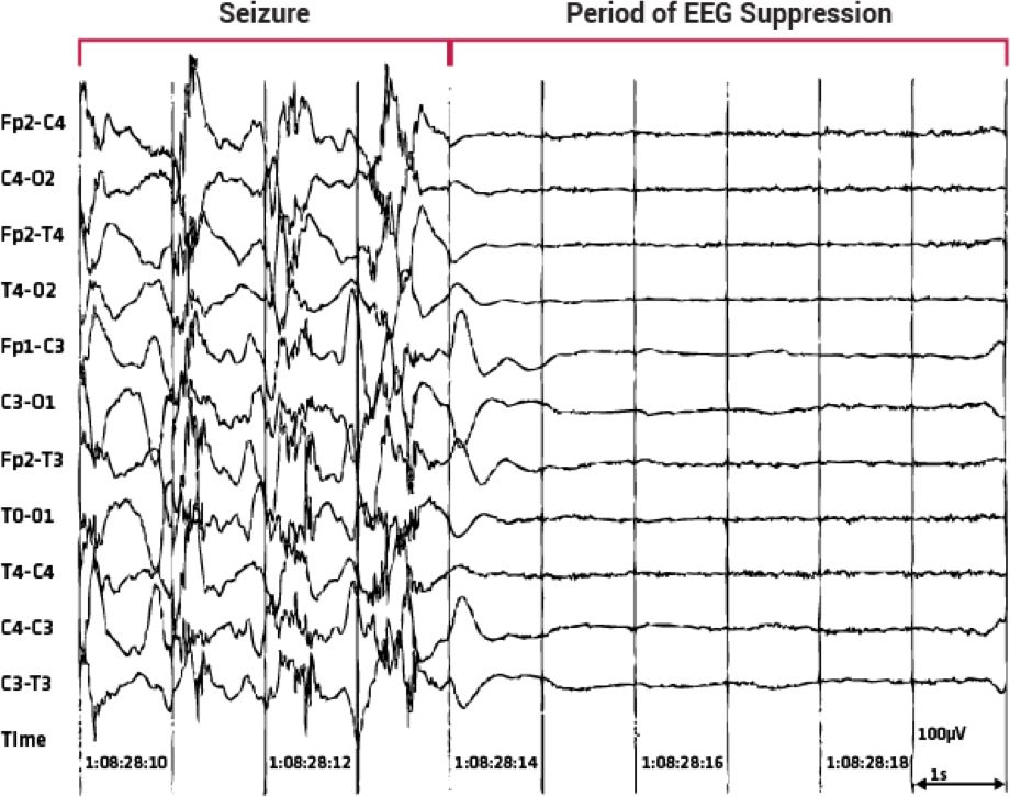 PGES (Post-ictal generalized EEG suppression) appears as a "flat" EEG following the seizure.