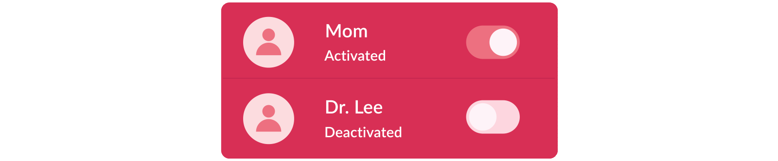 Caregivers can be activated and deactivated in the Alert App by tapping on the toggle next to their name. For example, if one of your caregivers is only available to help on Tuesdays and Wednesdays, you can set them as active on those days and deactivate them for the other days, while activating another caregiver.