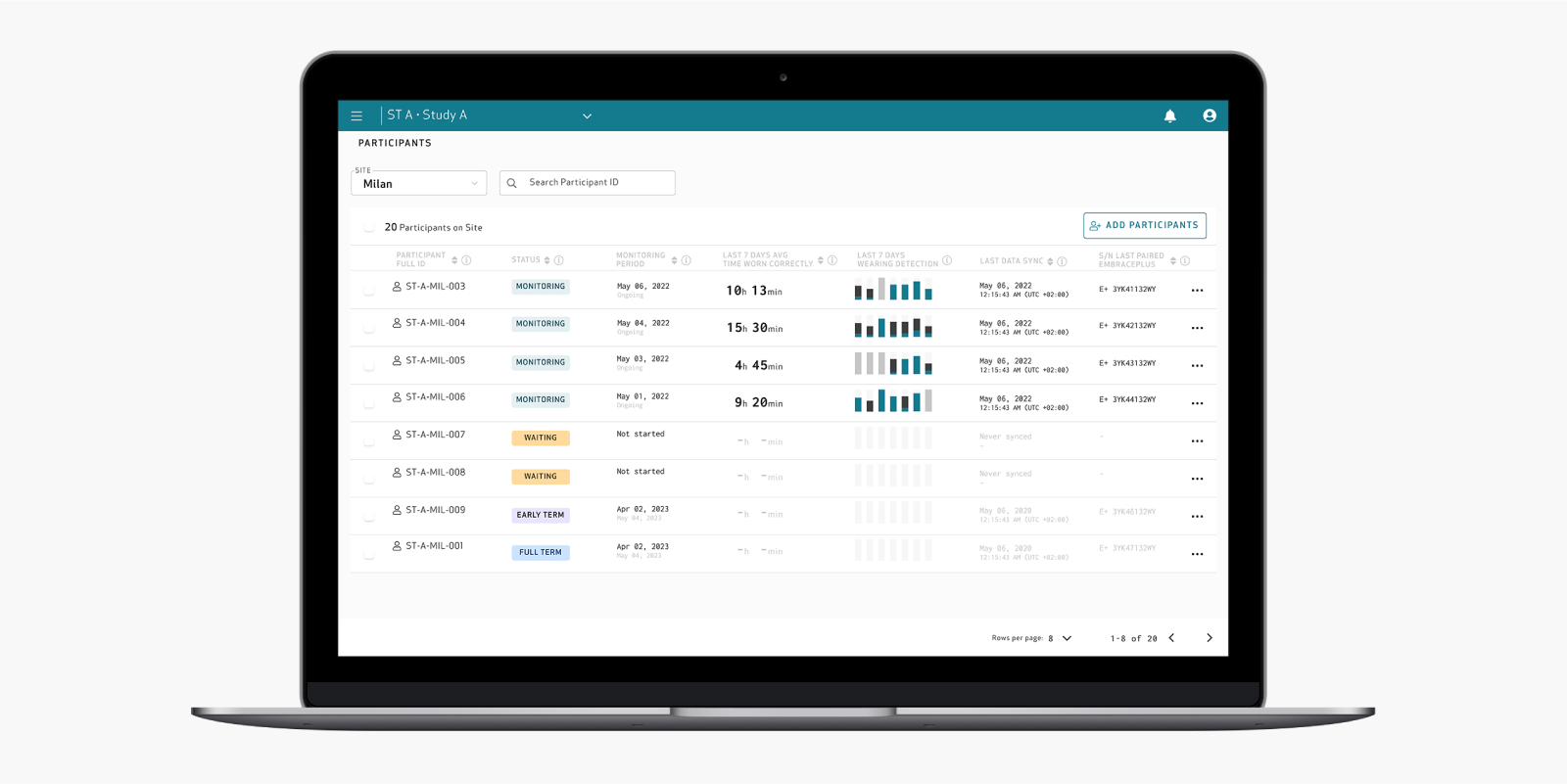 The Empatica Health Monitoring Platform also offers a digital biomarker that allows you to keep track of participant wearing time, so you know who is not using their EmbracePlus properly and can intervene in a timely manner.