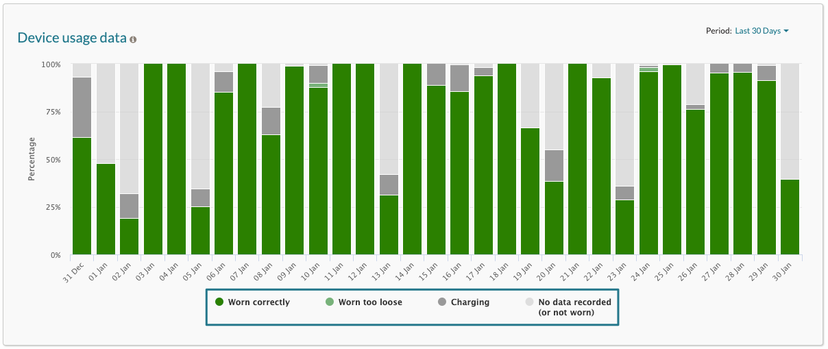 - The Last 7 days compliance includes a small summary chart of the percentage of time the watch has been worn correctly by the subject during the previous 7 days and the average value.