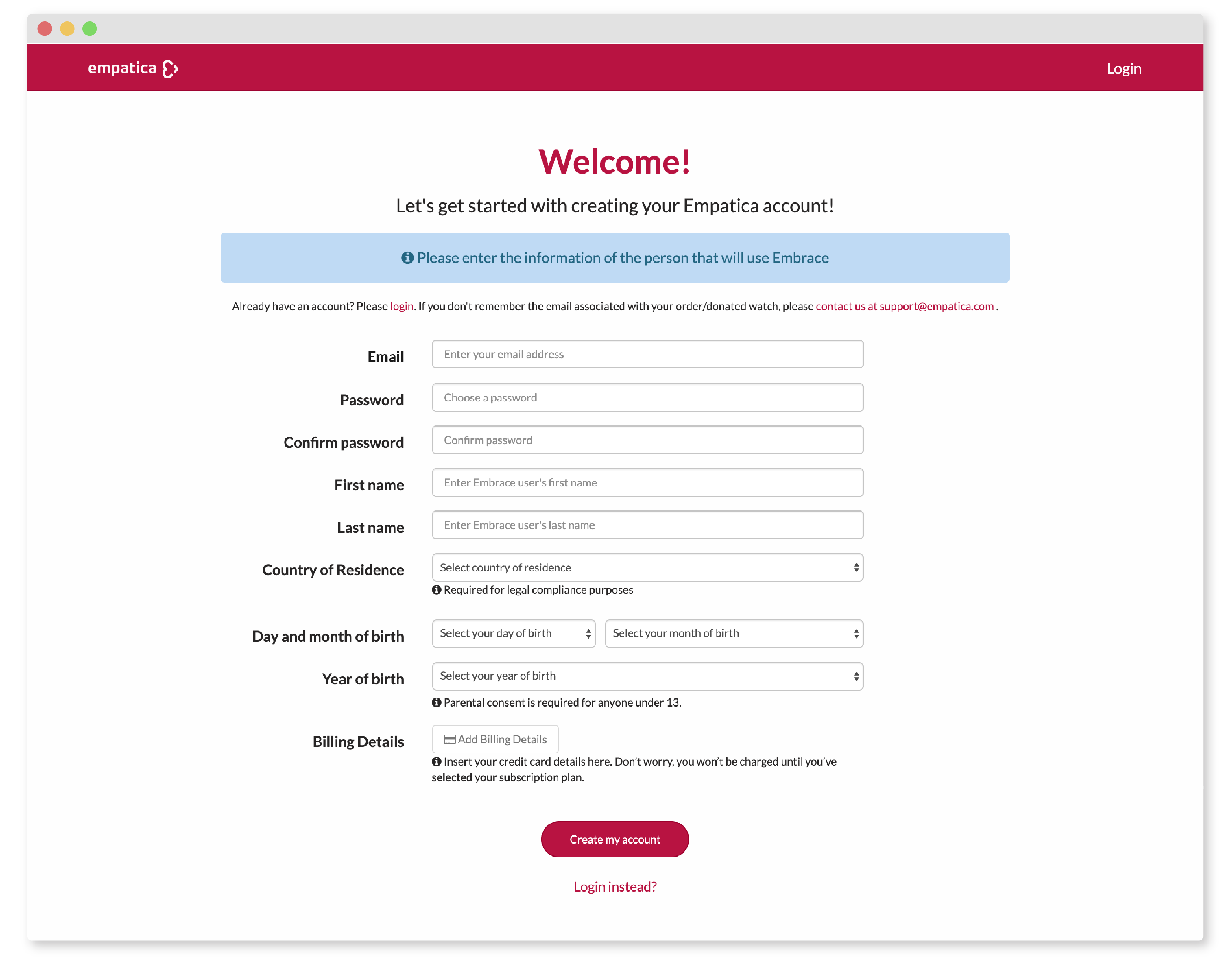 We recommend that you set up the account in your child’s name and with their information, since they will be wearing Embrace. If your child doesn’t have an email address, you can use your own or create one in their name, as long as you’ll be checking it regularly for important notifications about their Embrace journey.