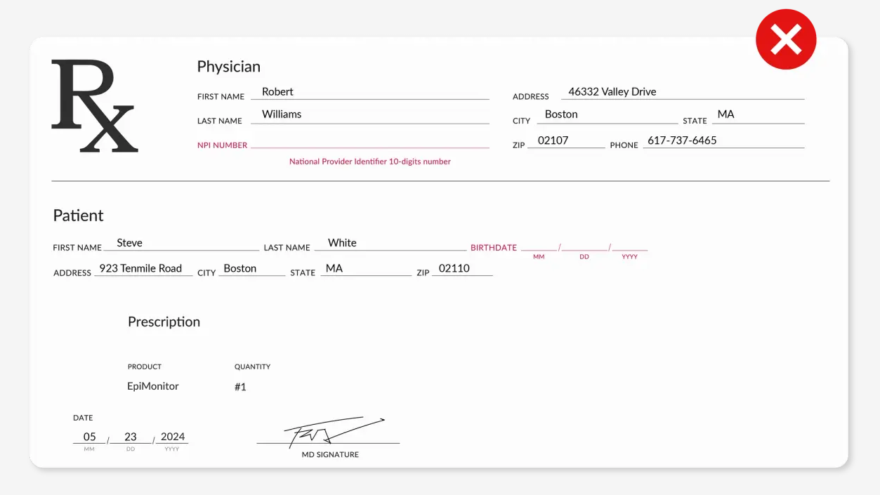 We cannot ship EpiMonitor unless all of the below information is indicated on the prescription. Remember, no field should be left blank: