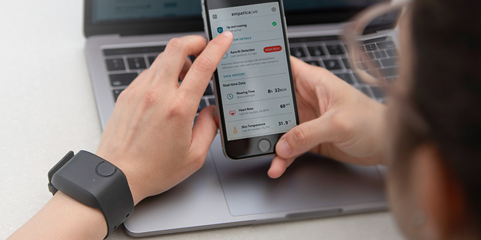 The Aura system works as an add-on to the Care platform and displays an output on the online dashboard, to indicate whether an individual wearing an Empatica wearable (the CE marked EmbracePlus) has a high or low risk of developing a respiratory infection. It will inform the wearer each day if their risk of infection is high, so they can stay at home, avoid contact with people outside their household, and reach out to their healthcare provider.